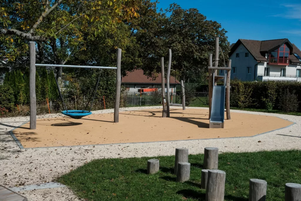 Le choix des matériaux, l’intégration paysagère et la gestion des flux sont étudiés en amont, afin de garantir une installation cohérente avec les besoins réels. Le choix des revêtements amortissants fait également partie de la recherche et propose des surfaces en copeaux de bois, sable, gravier, ainsi que des sols coulés et EPDM.